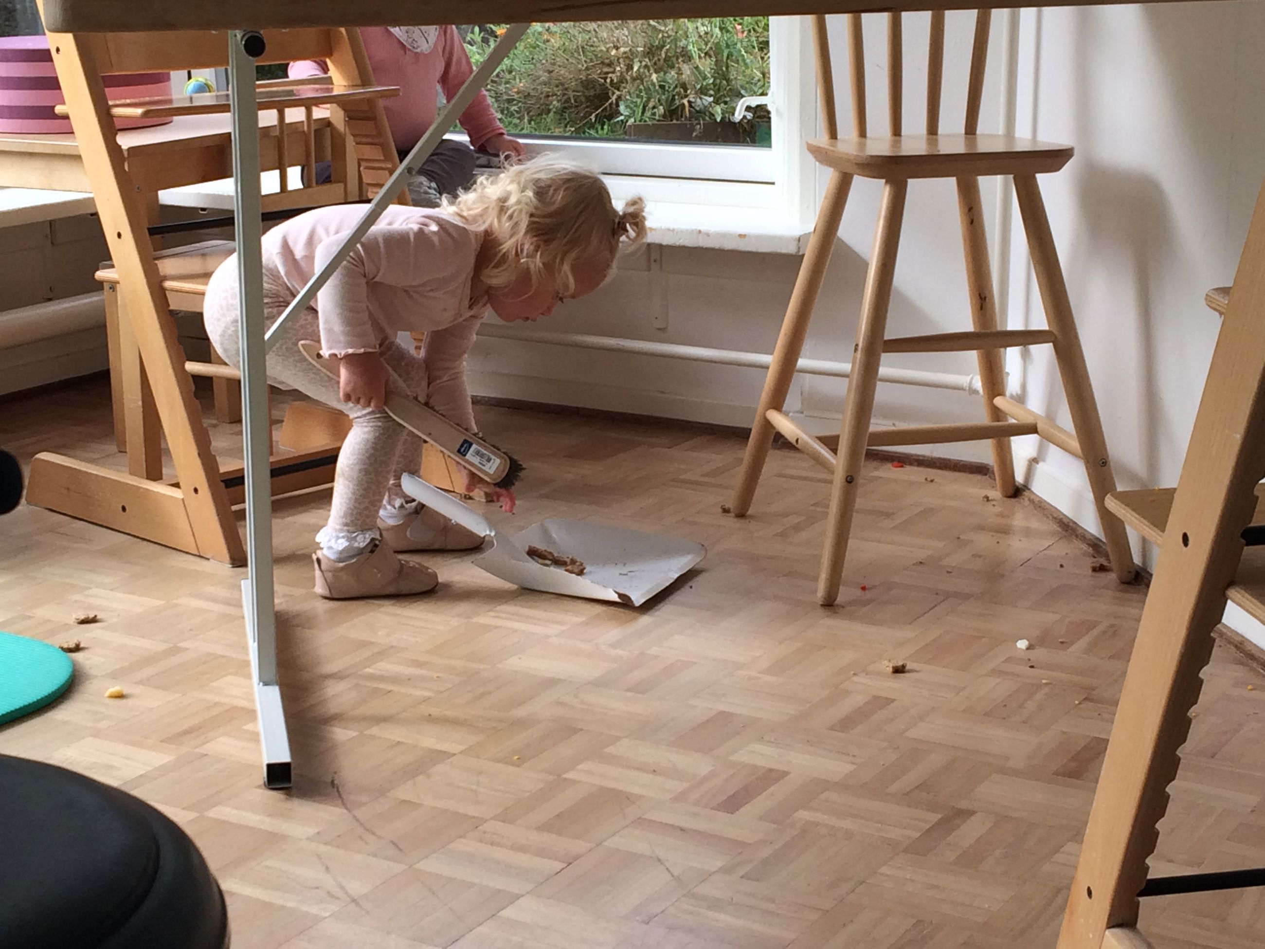 Efter frokosten hjælper børnene selv med at rydde af, ved at sætte tallerken, glas og bestik på rullebordet. Hos Pionererne er der 2 dukse der efter måltidet tørrer borde af og fejer gulvet.