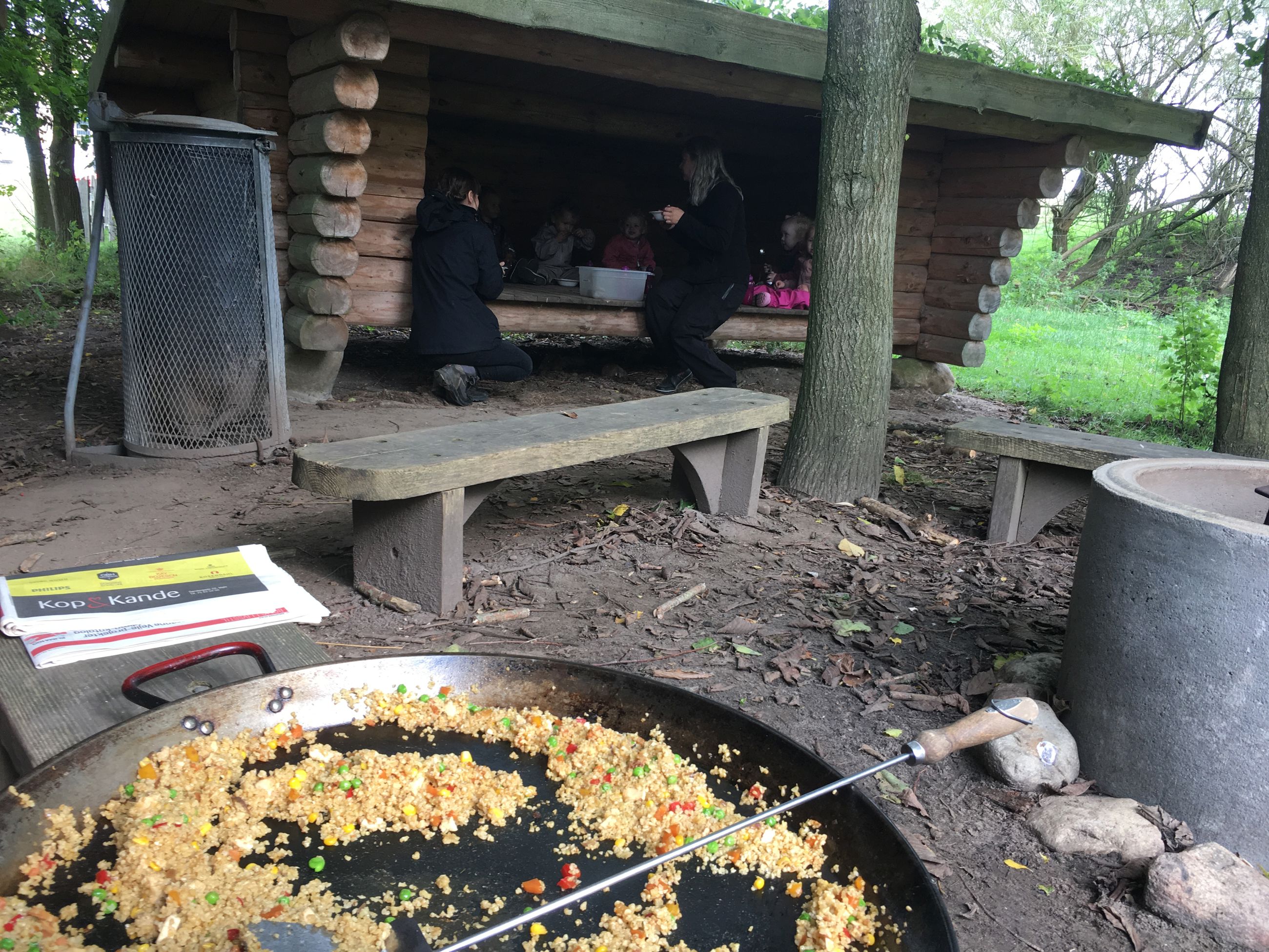 Hver tirsdag året rundt laves der bålmad i vores bålhus til alle børnehavebørnene. Det er det pædagogiske personale der sammen med børnene tilbereder maden over bål. Køkkenet er behjælpelige med at lave en del af tilbehøret ved behov. Maden der tilberedes over bål vil ofte være supper og forskellige typer af kød/grøntsagssovse. Når vi laver mad over bål, spiser vi som oftest ude eller i Laden.