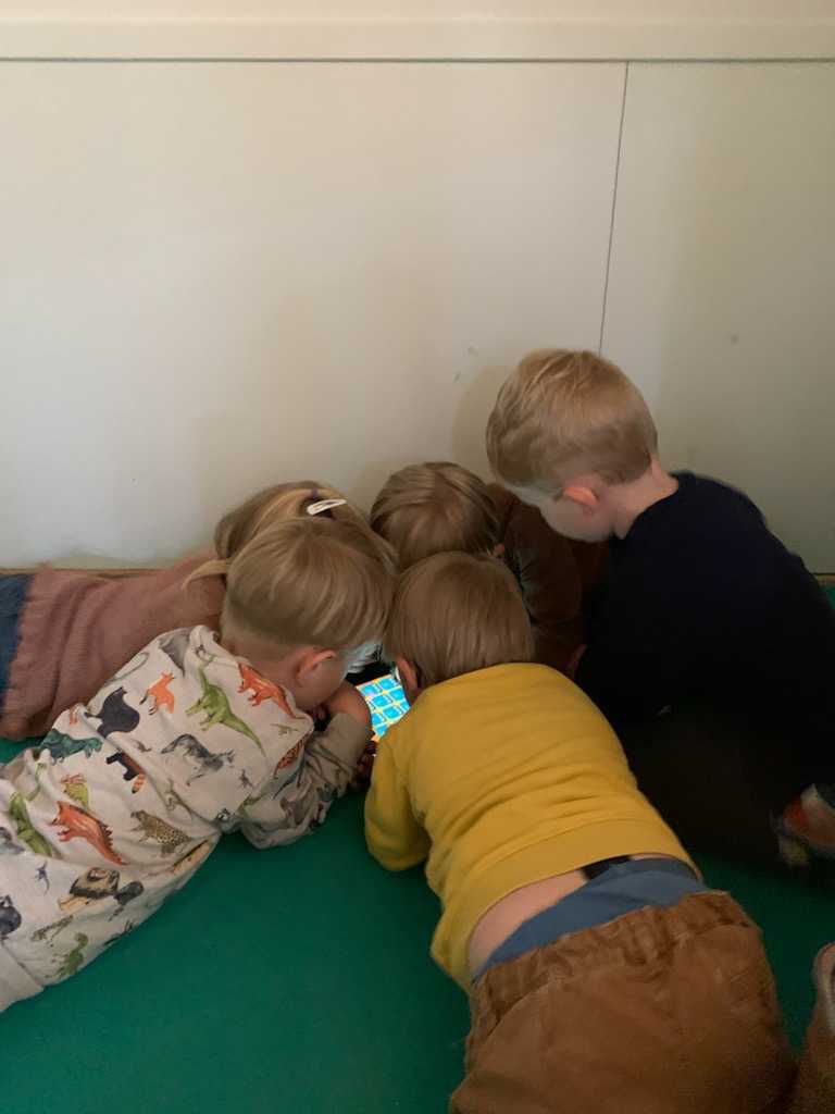 - Vi leger digital skattejagt, en person filmer sine fødder som går en rute i børnehaven eller på legepladsen, efterfølgende skal man så finde vej ved at følge filmen rundt.