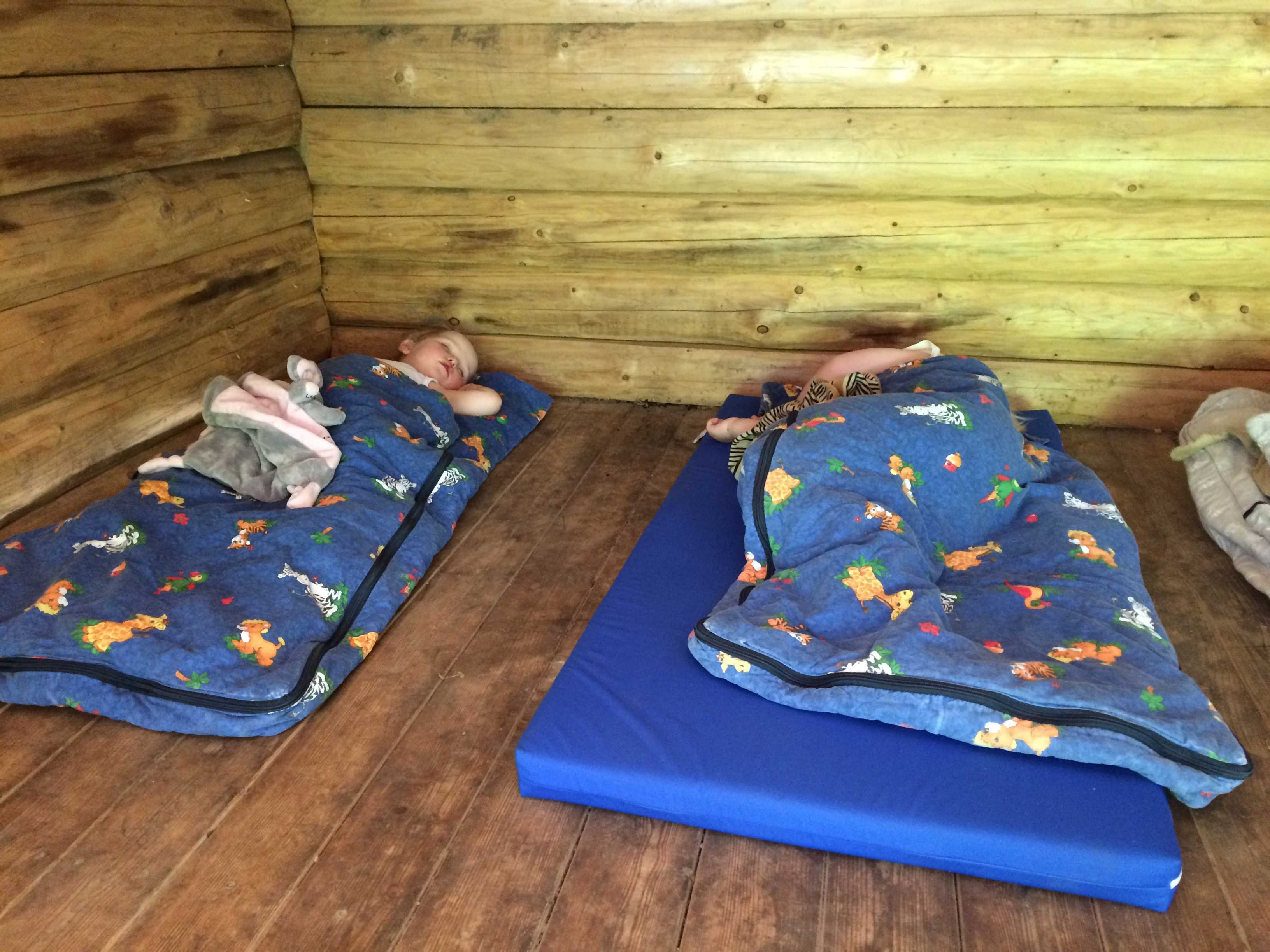 Den lille gruppe af sovebørn ligger på madrasser i soveposer, hvor de bliver puttet af en voksen og finder ro/falder i søvn til stille musik. Barnet kan medbringe sin egen bamse/sut til middagsluren.