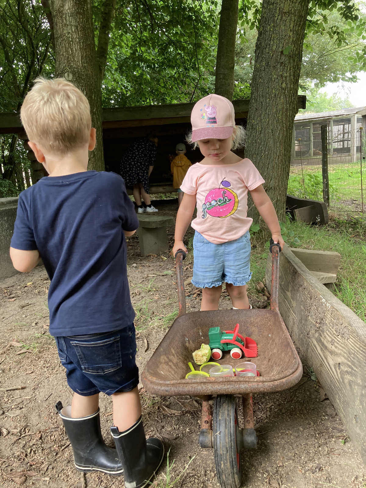 Børnene leger udenfor på vores fantastiske udearealer. I uderummet er der højt til loftet og vi elsker at være ude i al slags vejr. Der sættes små legeaktiviteter i gang, børnene leger i krogene, de løber og tumler, triller, gynger, klatrer, har rollelege, bygger med forskellige materialer, leger med sand, vand og mudder, der undersøges og udforskes. Ind i mellem har børnehavebørnene også den store glæde at få besøg af vuggestuebørnene/søskende som kommer og leger med.