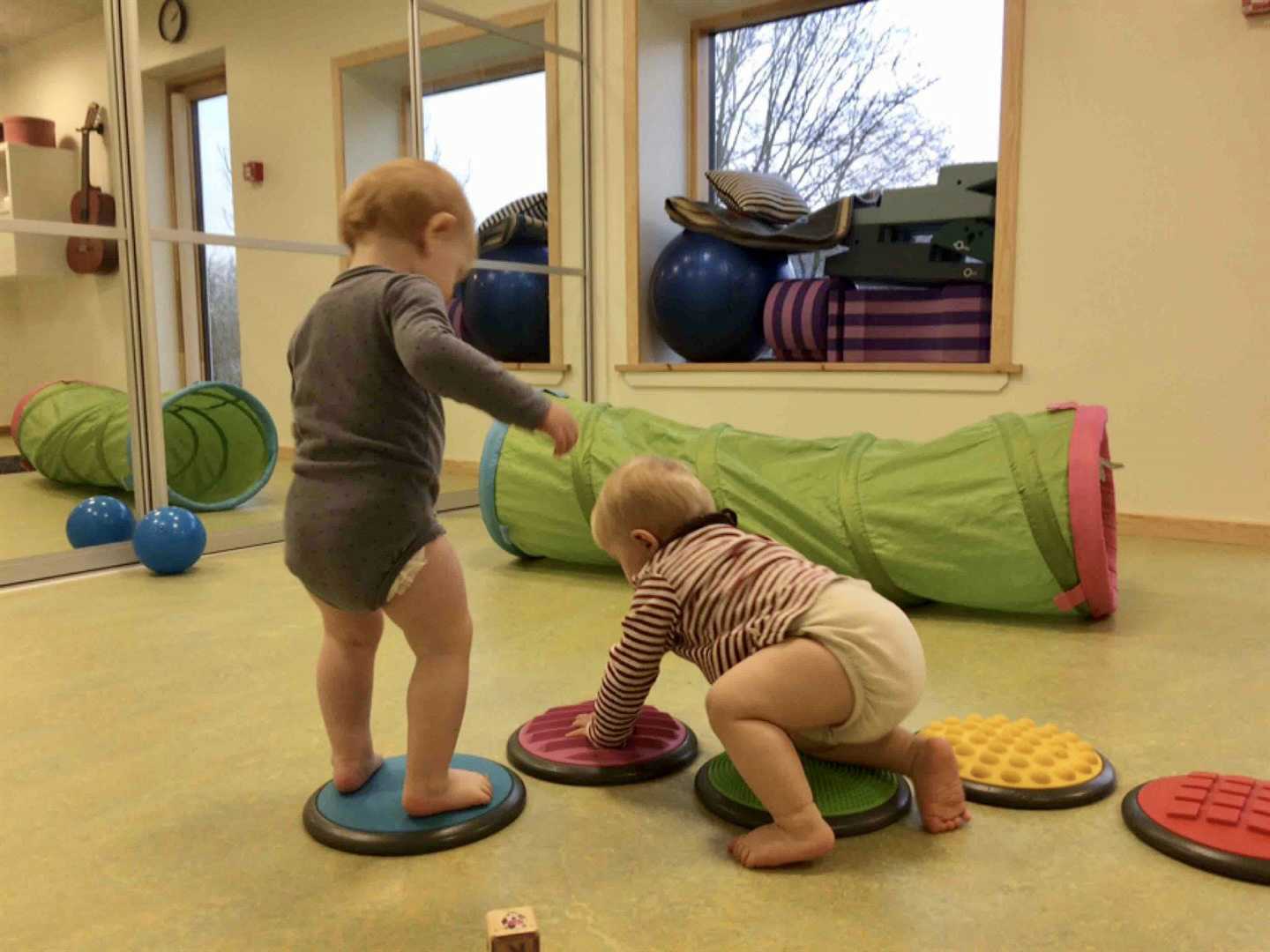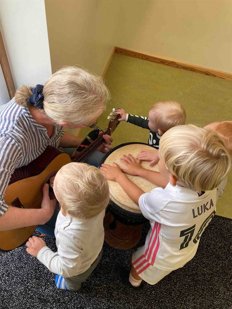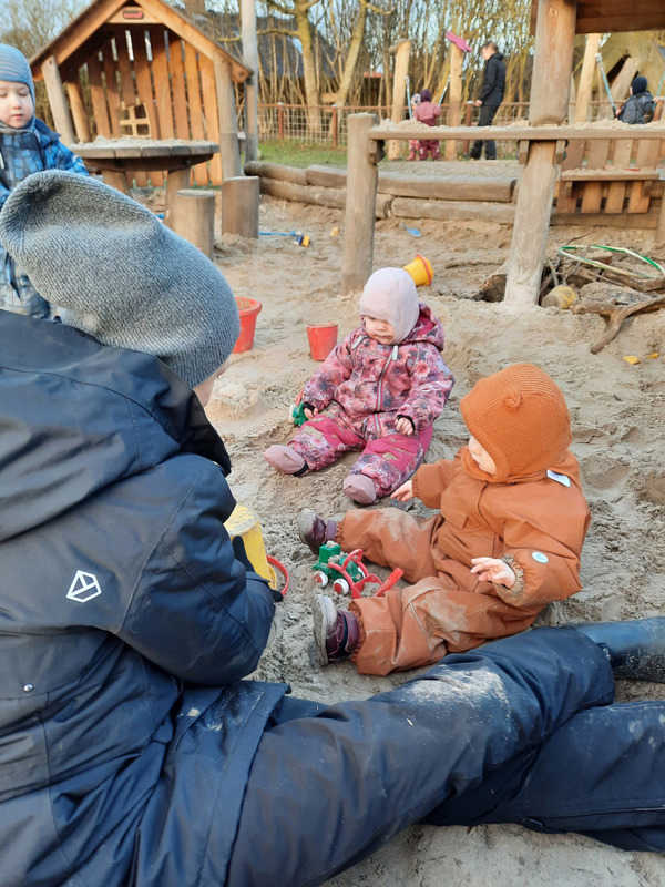 Ved at opdele børnene i mindre grupper i aktiviteter og til spisning oplever vi også, at der skabes ro omkring børnene. Når de ældste børn samles til planlagte aktiviteter, skabes der rum for tryghed, nærvær, ro og leg for de helt små inde på stuen. Vi oplever, at de helt små børn har brug for nogle rolige rammer, hvor de trygt kan gebærde sig, når det er tid til at lære at krybe, kravle eller gå.