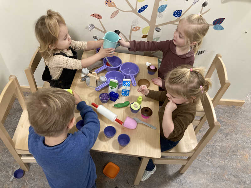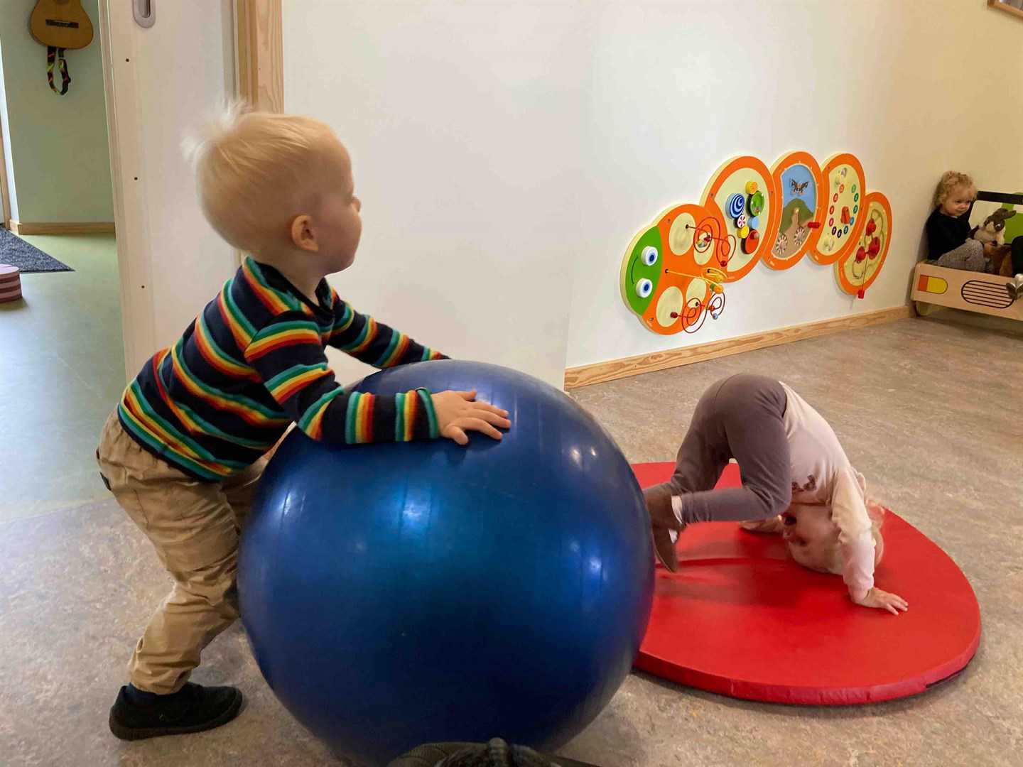 Kl. 7:30 fordeler vi os i vuggestuen - her er der åben dør mellem vuggestuegrupperne i afdelingerne og børnene kan lege på tværs.